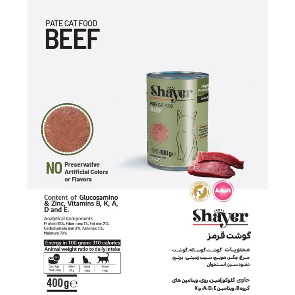 کنسرو غذای گربه با طعم گوشت قرمز شایر Shayer Pate With Beef وزن 400 گرم